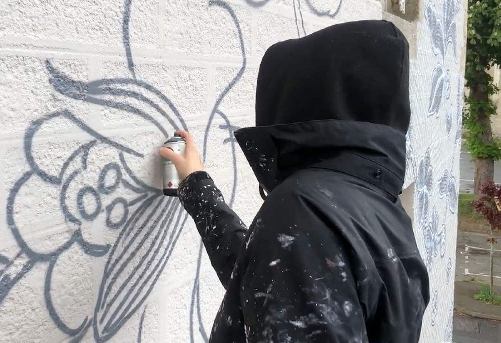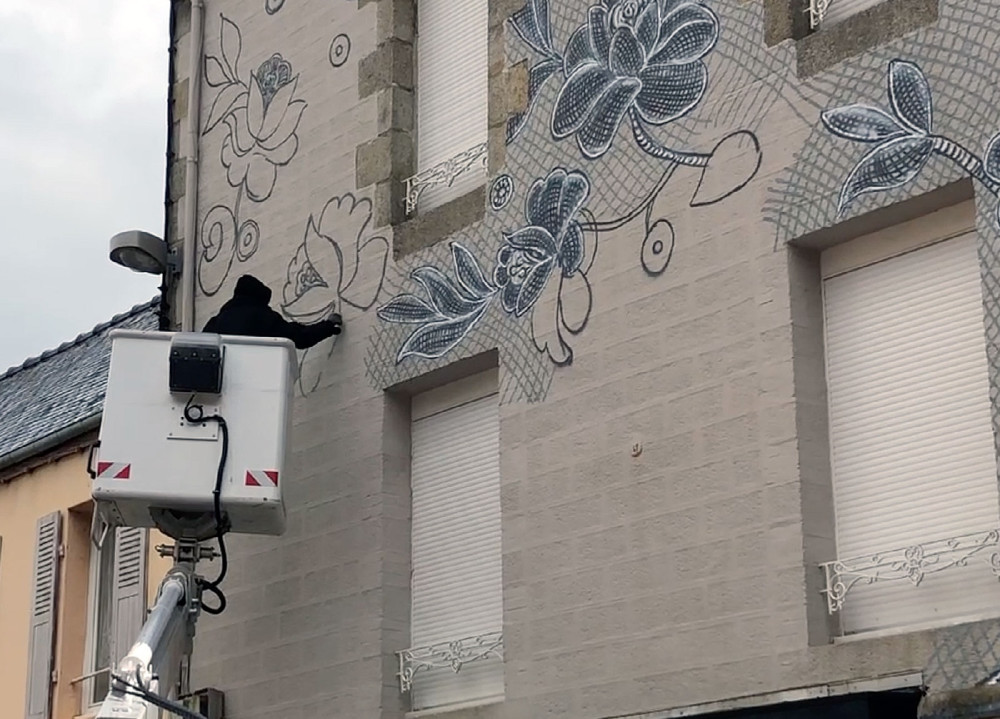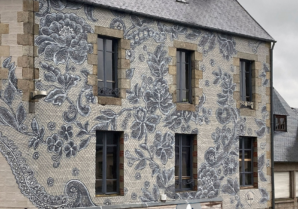 My newest mural was painted in the small town of Callac, in French Brittany, at In Cité, Festival écologique d’Arts Urbains. The pattern of the mural is inspired by the 19th century French needle lace. Freehand painted during 6-days session in the cold rain. Thank you so much for the care and hospitality to Cynthia Guyot, the whole team of La.fourmi.e and wonderful, friendly people of Callac!