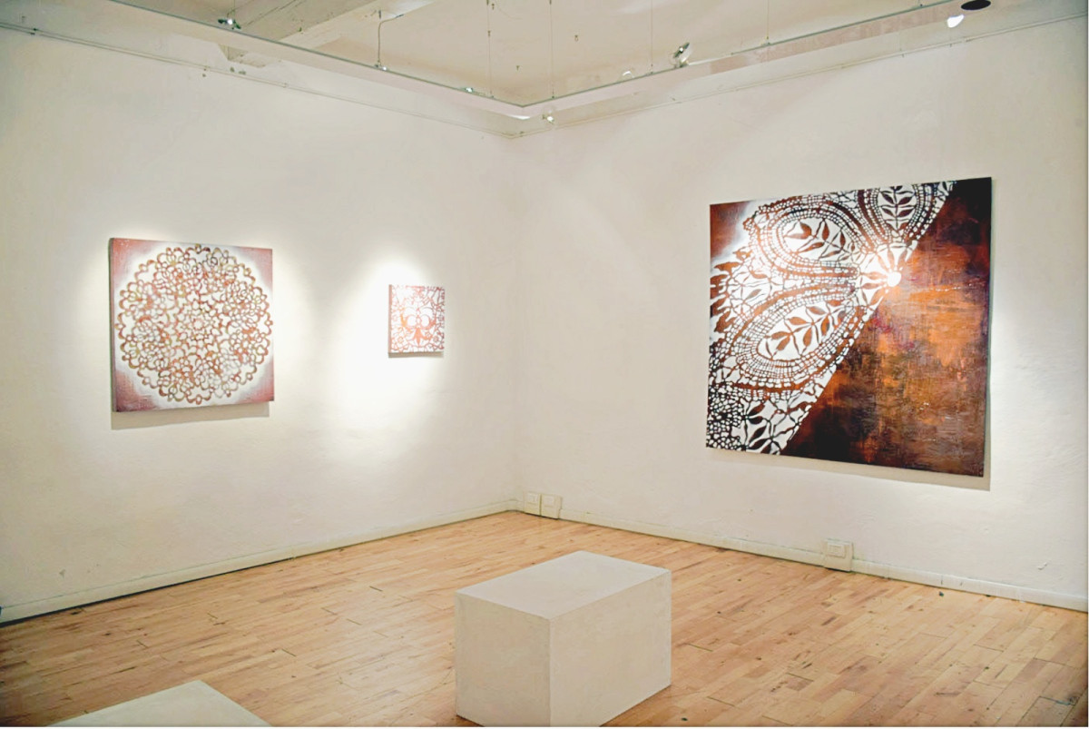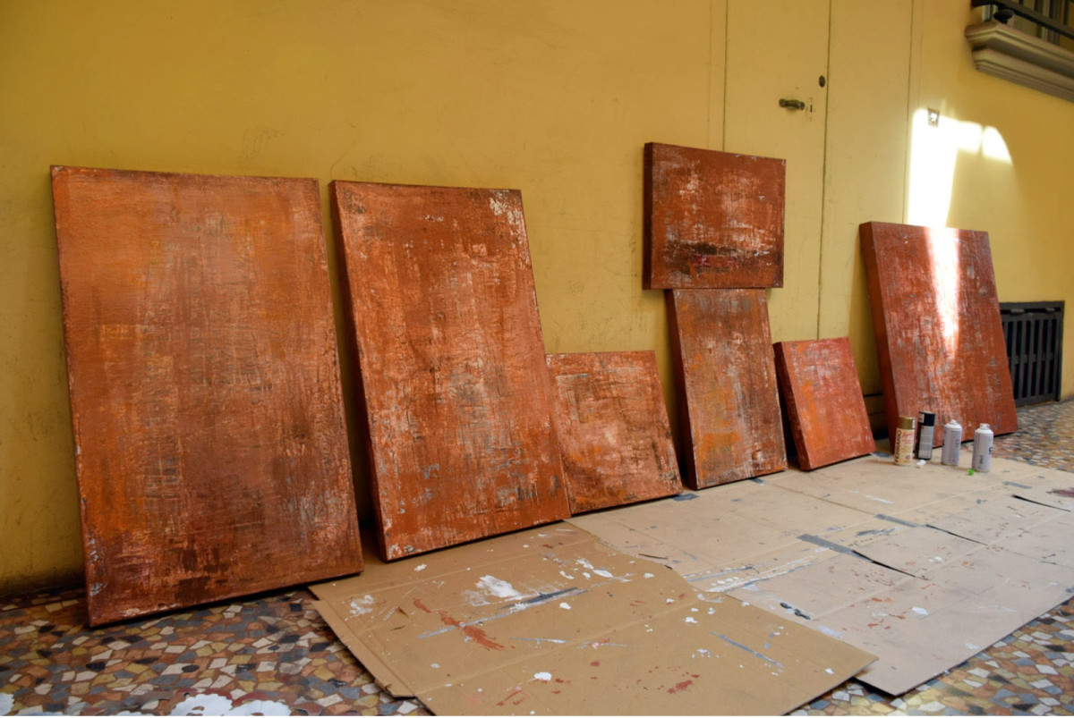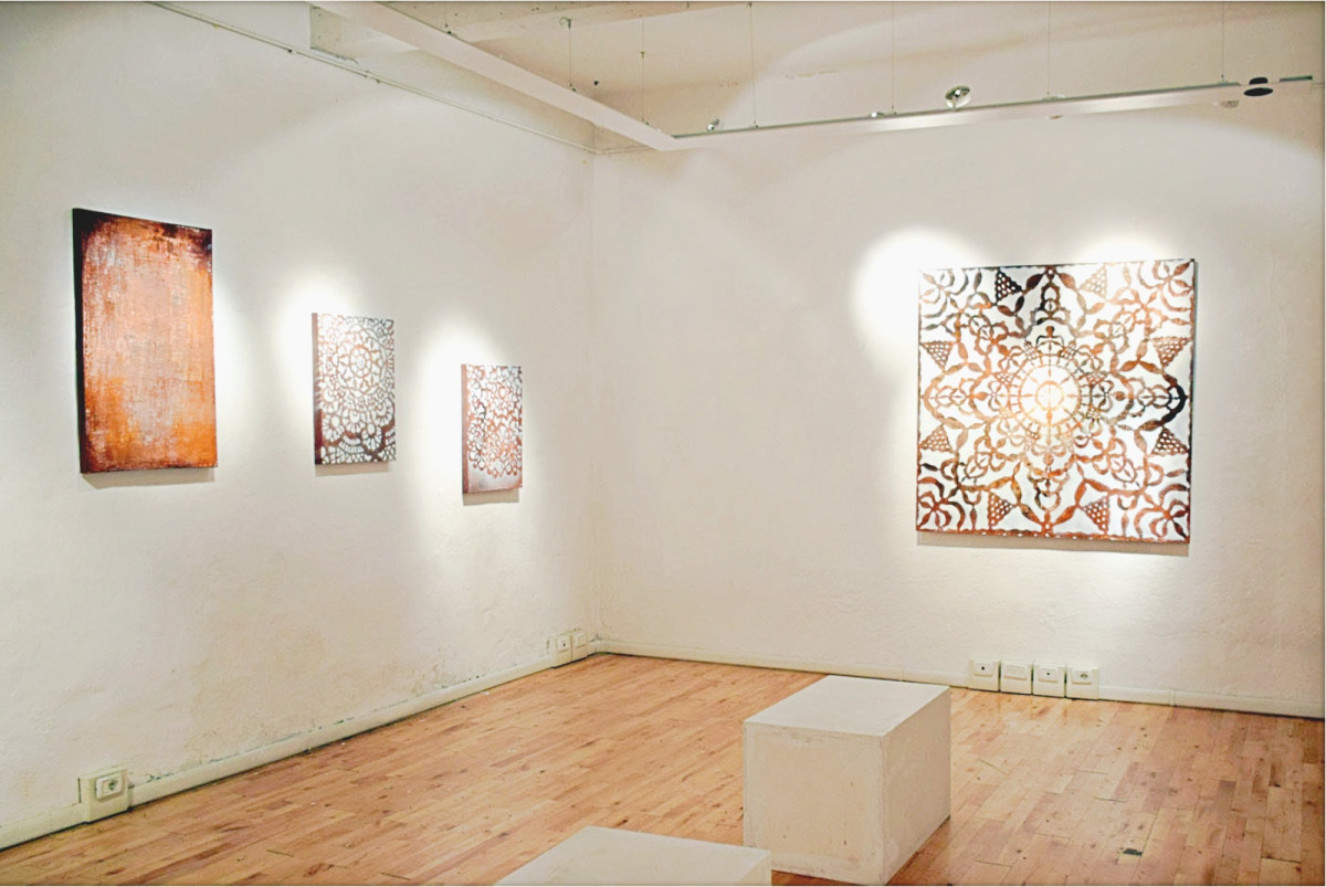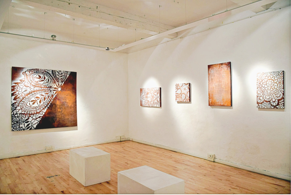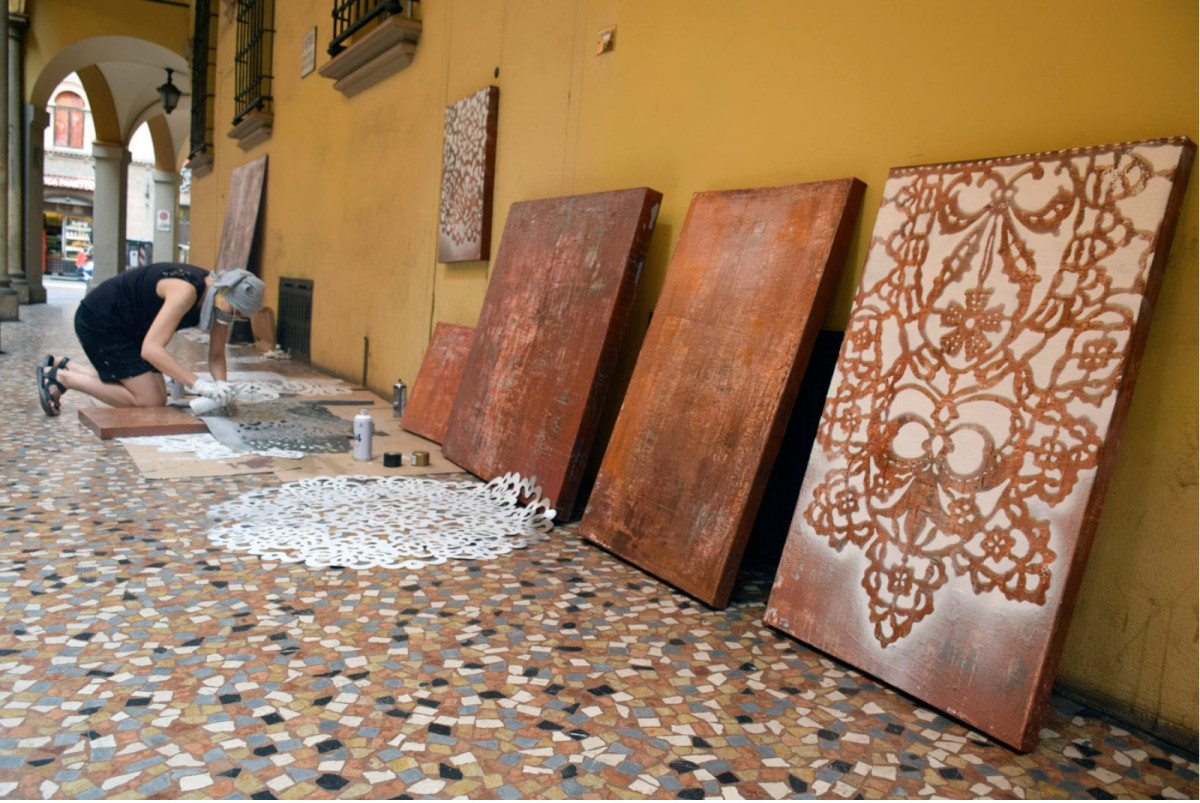 „Harmony. Walls of Bologna” is one of many possible answers on how to transfer street art from the streets to galleries. I did this by using the essence of colors of walls of Bologna as the background of my canvases. On such prepared piece I painted laces that I also paint in the city. Why laces? Because in laces there is an aesthetic code, which is deeply embedded in every culture. In every lace we find symmetry, some kind of order and harmony, isn’t that what we all seek for instinctively?