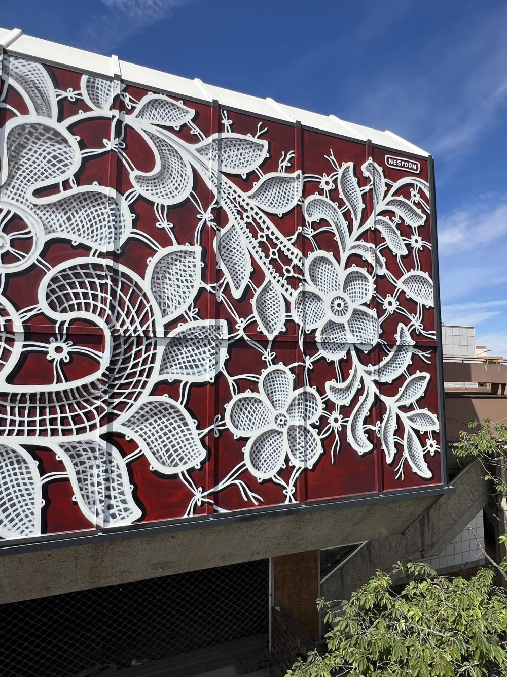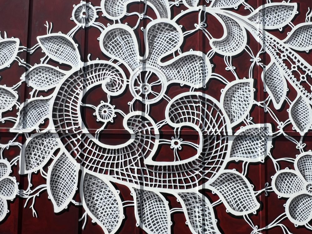 For the mural design, I drew inspiration from a very old piece of lace dating back to the 18th century. Though frayed at the edges with the passage of time, it still carries a remarkable beauty. The lace was entirely handmade using the traditional bobbin technique, making it not only a work of craftsmanship but also a fragment of cultural history.
